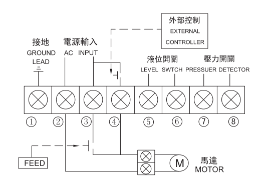 | 單相電壓 (VAC) | 功率 (W) | 異常輸出接點容量 (A) | 潤滑時間 | 間歇時間 | 吐出口徑 | 最大吐出壓 (kgf/cm2) | 吐出量 (cc/min) | 壓力開關 (kgf/cm2) | 液位開關 | 油箱容量 (L) | 重量 (kg) | |||||